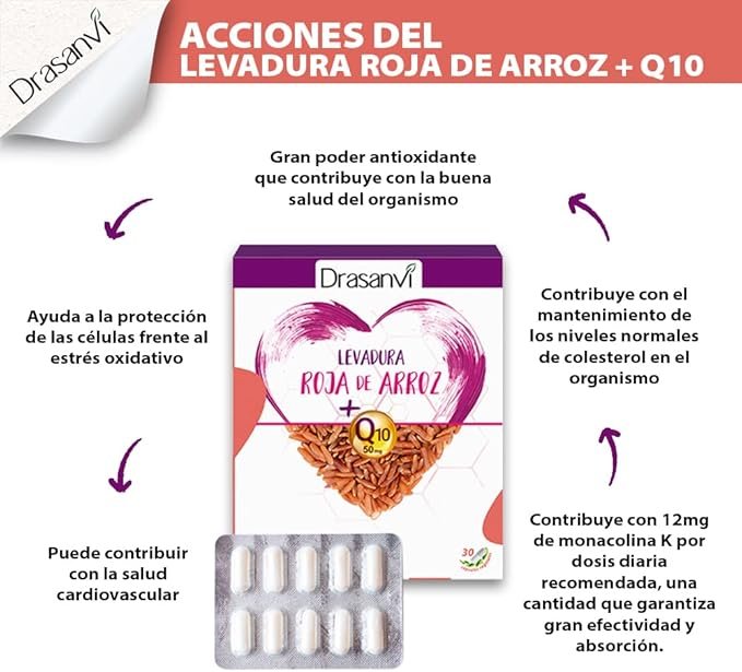 La Levadura Roja de Arroz es un producto obtenido a partir de la levadura llamada Monascus purpureus, que crece sobre el arroz. La Levadura Roja del Arroz presenta como principios activos unas sustancias llamadas monacolinas, entre las que destaca, por sus beneficios para nuestro organismo, la monacolina K. La monacolina K del arroz de levadura roja contribuye a mantener niveles normales de colesterol sanguíneo. Para conseguir este efecto, los estudios señalan que es necesario el consumo de al menos 10 mg de Monocolina K. Las cápsulas de Drasanvi aportan 12 mg de dicha sustancia por dosis diaria. Además está enriquecida con Coenzima Q10.