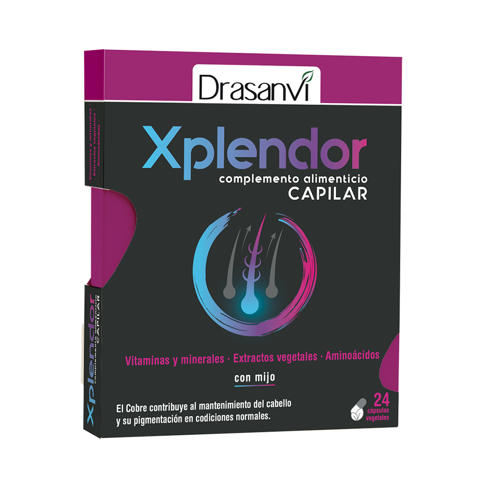 Xplendor es un complemento alimenticio rico en Vitaminas (13 vitaminas con el 100% de la Cantidad Diaria Recomendada), minerales (4 minerales con el 100% de la Cantidad Diaria Recomendada), aminoácidos y extractos vegetales ricos en principios activos y ácidos grasos. Su fórmula contribuye al mantenimiento del cabello y su pigmentación en condiciones normales. También aporta nutrientes importantes para el mantenimiento de la piel en condiciones normales.